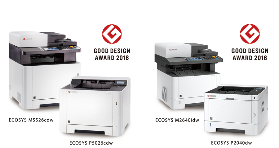 Osaka, Japan - November 9, 2016 - Kyocera Document Solutions Inc. (President: Takashi Kuki), one of the world's leading manufacturers of document imaging solutions and document management systems, is pleased to announce that its new A4 multifunctional products (MFPs) and printers, the ECOSYS M5526cdw, ECOSYS P5026cdw, ECOSYS M2640idw and ECOSYS P2040dw, have won the Good Design Award 2016 hosted by the Japan Institute for Design Promotion (JDP), a public interest incorporated foundation.