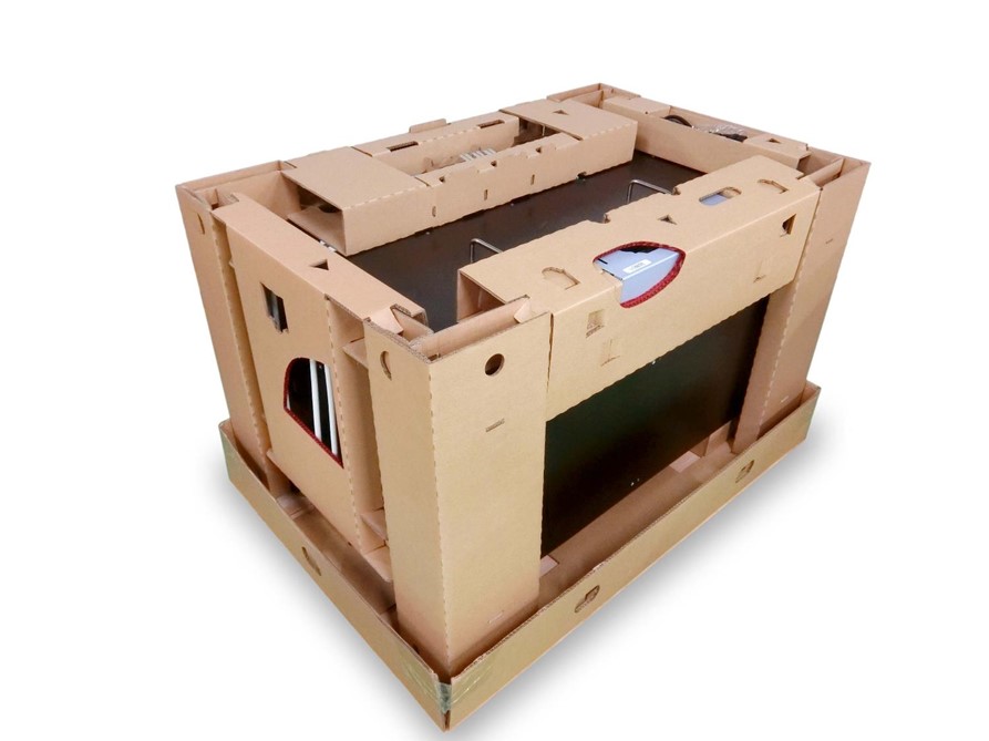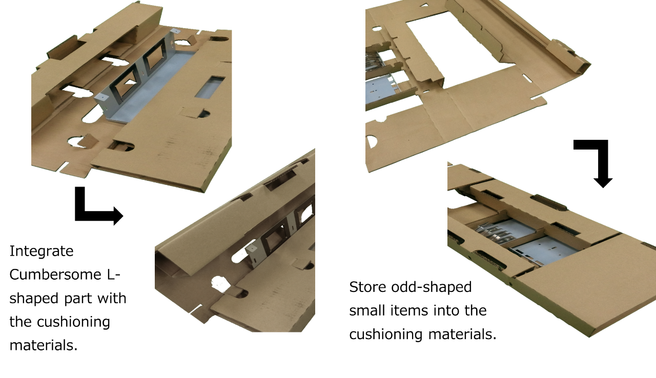 The key to environmentally friendly packaging is how compact the packing boxes used for packaging can be. In the packaging of a "high-capacity ink supply unit," a peripheral device for commercial inkjet printers, the challenge was how to fit the bundled items into the packing box. The bundled items come in a wide variety of shapes and materials, including L-shaped components and long hoses that cannot be bent. We developed a new packaging method in which the bundled items are stored inside the cushioning material used for the machine itself so that the size of the package is not increased by these bundled items. As a result, the number of layers in the shipping container can be reduced from two to three, improving shipping efficiency by 50% and eliminating the need for packing boxes for bundled items. As a result, the number of materials used for packaging was reduced by 30%.