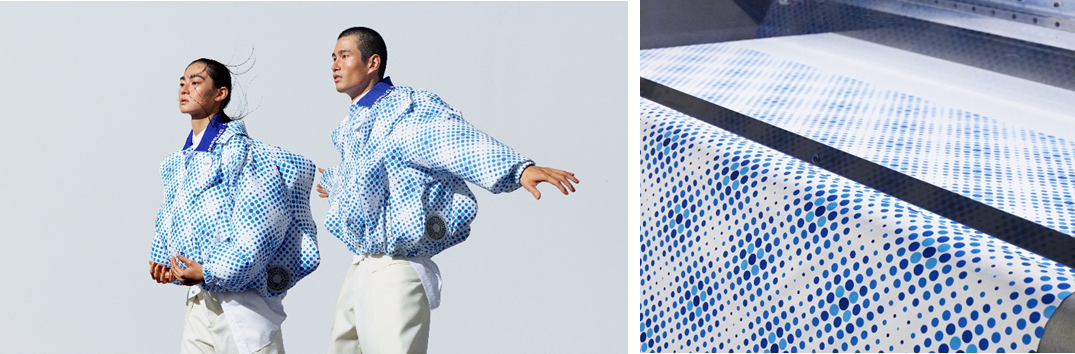 The dot pattern on the uniform expresses the connection between individuals, transcending division and disparity. Dots of varying sizes and colors gently blend together across boundaries, uniting as one. By likening these dots to drops of water, the way they connect without boundaries symbolizes diversity and harmony. In such a design, FOREARTH's technology, which uses minimal water, was essential. Through the paradoxical expression of depicting the "form of water" without using water, it presents a vision of new craftsmanship that connects to the future.