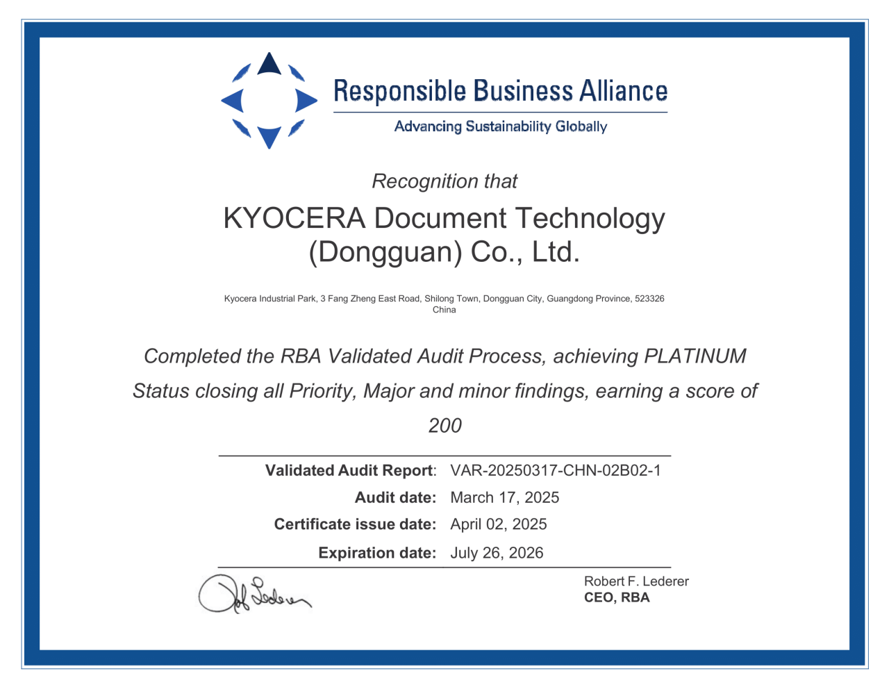 Kyocera Document Solutions Inc. (President: Takashi Nagai) is pleased to announce that its factory, KYOCERA Document Technology (Dongguan) Co., Ltd. (hereinafter: China Plant), has achieved Platinum certification, becoming the first within our group to do so, under the Responsible Business Alliance (RBA) Validated Assessment Program* (VAP) audit program.