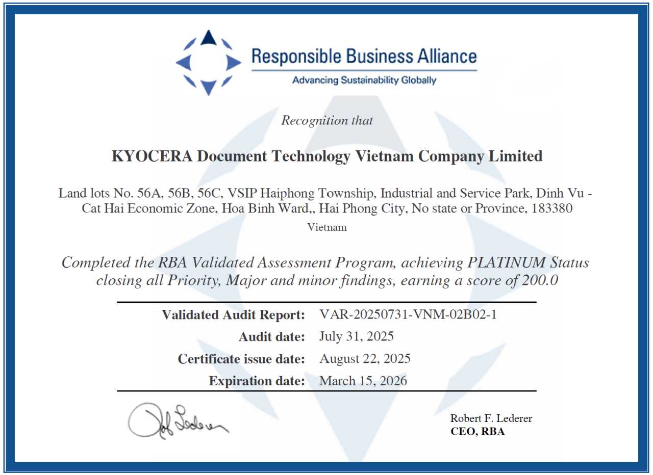 Kyocera Document Solutions Inc. (President: Takashi Nagai) is pleased to announce that Kyocera Document Technology Vietnam (hereinafter: Vietnam plant) has obtained the Platinum Certification under the Responsible Business Alliance (RBA) Validated Assessment Program* (VAP) audit. This marks the second facility within the Company to receive Platinum Certification, following KYOCERA Document Technology(Dongguan) China plant.
