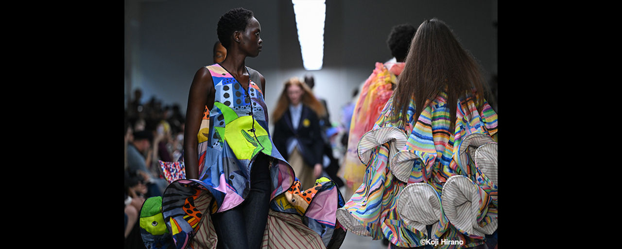 Kyocera Document Solutions Inc. supported the production of dresses using artworks painted by artists contracted to HERALBONY for ANREALAGE’s Collection at Paris Fashion Week SS 2026, held on September 30, 2025. The collection comprised 30 outfits, 26 of which used fabrics printed with our sustainable inkjet textile printer "FOREARTH". For this collection, 21 vibrant designs by 18 artists contracted to HERALBONY were printed onto wide range of fabrics and, through ANREALAGE’s craftmanship, transformed into distinctive garments that conveyed movement and vitality. FOREARTH printing was used for bags and shoes, giving their designs an inner glow that attracted significant attention.
