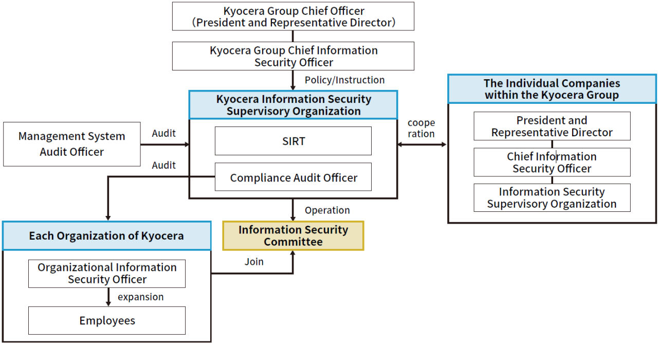 To protect and appropriately manage information assets, the Kyocera Group has established the Information Security Committee, and the Chief Information Security Officer is responsible for overall information security management.