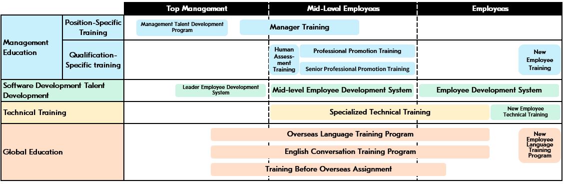 We conduct role-specific training for responsible personnel, who are leaders in the organization, with the aim of developing executive employees equipped with advanced management capabilities. Additionally, through hierarchical training that allows employees to gradually acquire the necessary skills and knowledge at each stage—from entry-level to mid-career, and from mid-career to executive management—we aim to enhance management capabilities.