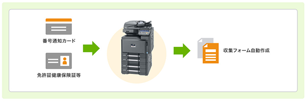 企業にとって負荷のかかるマイナンバー情報の収集作業においては、複合機を使用して、正確かつ簡単となる業務ソリューションを提供します。複合機で、ガイドに従ってマイナンバー通知カードおよび、本人確認書類を読み込むだけで、マイナンバーを紙に印刷して保管が可能となり、マイナンバー収集作業を効率化することができます。