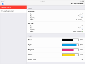 用紙カセットや手差しトレイの用紙サイズ、種類、容量の情報に加えて、装着されている用紙カセットなど仕様の確認ができます。さらに、トナー残量の確認もおこなえるため大量印刷を行う際に、事前に消耗品の補充などが手元のスマートフォンなどで確認することができます。