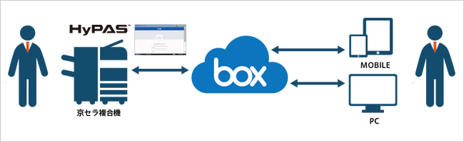 クラウドサービスを駆使したワークスタイルに最適な環境を提供するため、京セラ複合機から、クラウドコンテンツプラットフォーム「Box」へ接続し、スキャンしたデータを直接クラウド上に保存することや、クラウドに保存されている書類を直接印刷することができる、HyPASアプリケーションです。