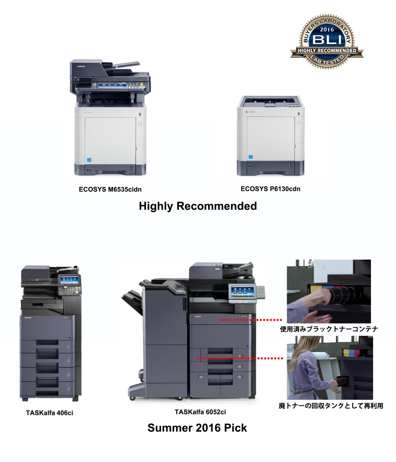 京セラドキュメントソリューションズ(社長:九鬼 隆、以下、当社)は、ドキュメント機器に関する独立調査機関である米国Buyers Laboratory LLC(以下BLI社)より、当社のカラーA4プリンター「ECOSYS P6130cdn」とカラーA4複合機「ECOSYS M6535cidn」が「Highly Recommended」に認定され、カラーA3複合機「TASKalfa 6052ci」シリーズの使い終わったトナーコンテナを回収タンクとして再利用できる機能と、カラーA4複合機「TASKalfa 406ci」が「Summer 2016 Pick」を受賞したことをお知らせします。