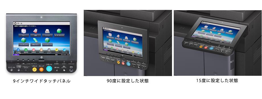 昨年2016年8月より発売を開始したカラーA3複合機「TASKalfa 6052ciシリーズ」と同じ、視認性が高く、軽いタッチで快適にお使いいただける9インチワイドタッチパネルを採用しています。また、操作部のハードキーの数を最小限に抑え、すっきりとした操作部です。操作部は角度を変えられるチルト機構に対応しており、操作部の角度を使用する人の視線に合わせて90度から15度まで無段階で調整することができます。