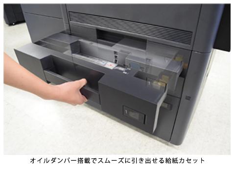 給紙カセットには、最後まで押し込まなくても良い、オートクローズ機能を採用しています。引き出すときも余計な力をかけずに引き出すことができます。今までよりも少ない力で給紙カセットの開閉が可能です。さらに開閉時の音の軽減も実現しました。