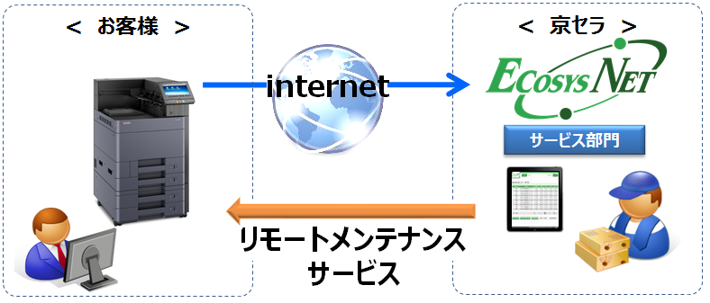 社内ネットワークに接続されているプリンターの状態を監視するリモートサービスで、より快適に機器管理・運用が可能です。例えばプリンターのファームウェアをリモートで更新する、給紙ユニット故障時にリモートで機能的な切り離しを行いプリント自体は可能にするなど、お客様に常に安心してお使いいただけるサービスを提供します。