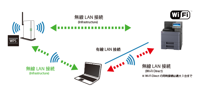 通常の有線LANに加え、オプションで無線LAN※1、Wi-Fi Direct※2の3つのネットワークに同時接続が可能です。これにより、複数の基幹・業務システムごとに導入していた機器を集約することができ、導入コストを削減できます。また無線LANを活用すれば、LANケーブルレスでの使用が可能になるため、設置場所の制限を受けません。