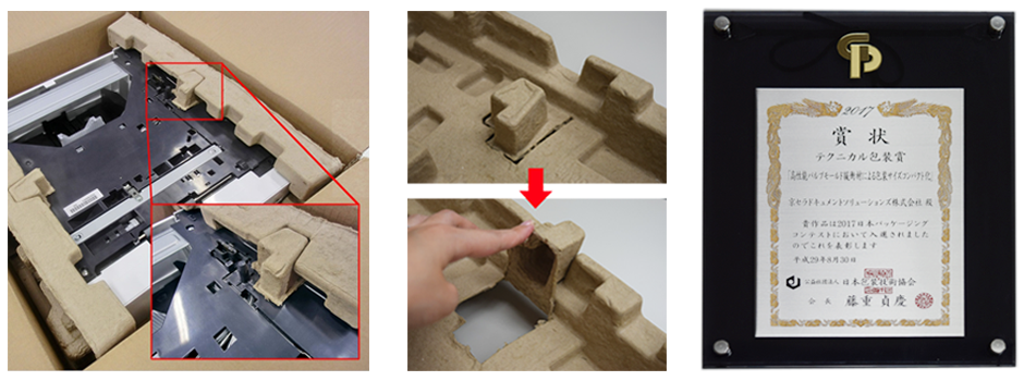 「高性能パルプモールド緩衝材による包装サイズコンパクト化」と題した受賞作品は、製品の突起部を保護するため、緩衝材の一部を切り抜き、折り曲げて凹凸はめ込みのできる形状にすることで、ケースの大型化を行うことなく突起部を保護することが可能になりました。 形状を工夫することによって、従来に比べ高い緩衝性能を持たせることができたこと、また給紙カセットの左右に装着する緩衝材を共通化することで、包装部材の点数および使用量の削減を実現したことが、高く評価されました。