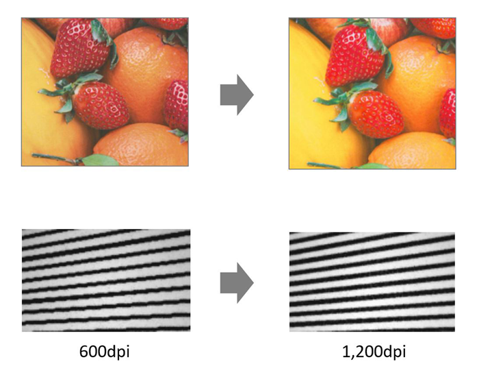 1,200dpiの高解像度により、鮮明さが加わり表現力が高まります。更に曲線や細線が滑らかに再現され、文字つぶれのない繊細な表現を実現しています。