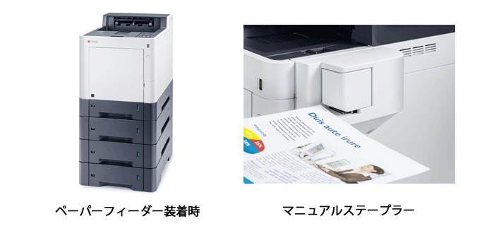カラーA4プリンターECOSYS P7240cdnは本体寸法390(W)×532(D)×469.5(H)㎜の省スペース設計で、デスクサイドはもちろん店舗窓口、バックヤードなど設置場所を選びません。片面プリントカラー、モノクロ毎分40枚※1の高速連続出力に加え、ファーストプリントタイムは、カラー6.5秒以下、モノクロ5.5秒以下※2です。窓口などでお客様をお待たせすることなく、単ページ出力の業務が可能です。ペーパーフィーダー※3を増設することで最大2,100枚の大量出力にもお応えします。