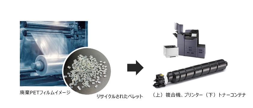 今回転用される部品は、複合機、プリンターの消耗品であるトナーを充填するケース(トナーコンテナ)などで、今後、再生材を使用したトナーコンテナへの置き換えを目指してまいります。今回のアップサイクルによりPETフィルムを廃棄することなく複合機やプリンターの部品へ生まれ変わらせることが可能になります。今後はトナーコンテナだけではなく、内部部品や外装部品にまで展開し再生材使用率を一製品あたり50%まで高める事を目指します。