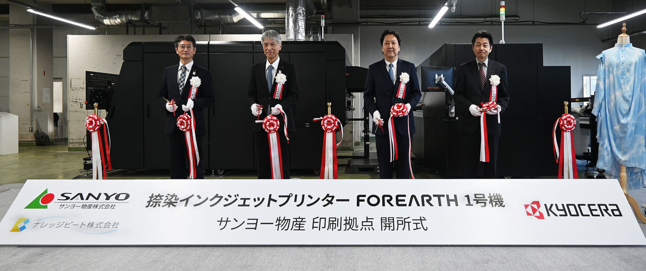 京セラドキュメントソリューションズ株式会社(社長:安藤 博教、以下:当社)は、大阪に本社を置く縫製メーカーのサンヨー物産株式会社(大阪市淀川区 代表取締役:矢野 宏和、以下:サンヨー物産)様が、1号機となる当社の捺染インクジェットプリンター「FOREARTH(フォレアス)」を導入し、印刷拠点(南港工場兼配送センター)の開所式を開催したことをお知らせします。