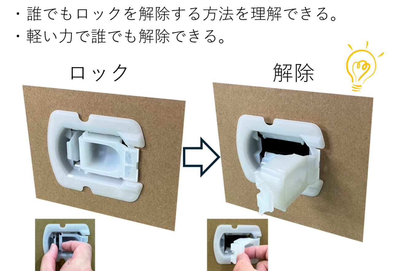新しく採用されたジョイントパーツは、取り外しが容易に理解できる形状にし、さらに、ロック機能は維持したうえで、軽い力でロックを解除できる新機構を採用しました。