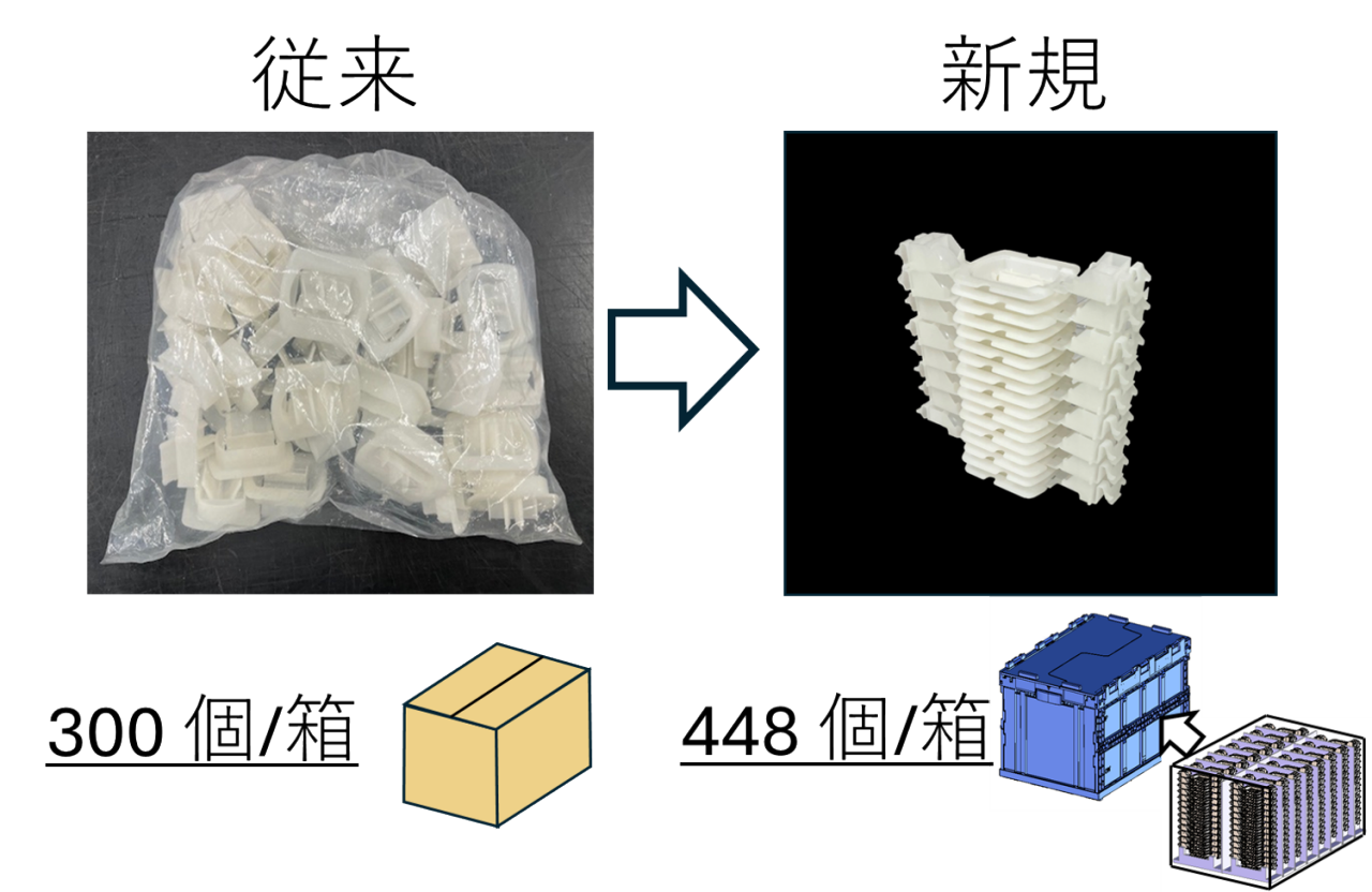 ジョイントパーツを重ねる事ができる形状にすることで、無駄な空間をなくし輸送箱に多くのジョイントパーツを詰め込むことが可能になり、輸送効率を大幅に改善しました。これにより輸送効率も大幅に向上し、さらに輸送時のCO2削減にも大きく貢献しました。