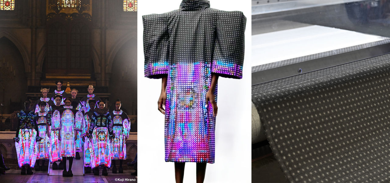 ANREALAGEと京セラのコラボレーションも3回目を迎え、今回のコレクションでは “SCREEN” をテーマに、洋服そのものが光を映し出す媒体となる新たな表現に挑戦しました。FOREARTHの8色インクのプリント技術を活かし、従来のCMYK4色では難しかった光の三原色RGB(Red/Green/Blue)の鮮やかな発色を実現。光の印象を損なうことなく、まるで発光しているかのような視覚効果を生み出しました。また、ジャガードやベルベットなどのテクスチャーのある生地にも、顔料インクがその風合いを損なうことなくしなやかに馴染み、新たな質感表現を可能にしました。