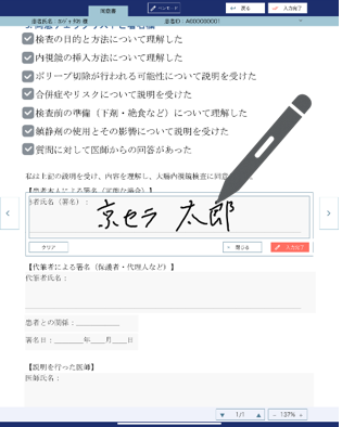 チェック欄の記入漏れがないかを目視で確認する必要があるなど、同意漏れが生じるリスクがありました。必須入力欄を赤枠で強調表示するなど、柔軟な運用が可能かつ記入漏れチェック機能もあり、医師と患者様に安心して同意いただける環境を提供することが可能です。