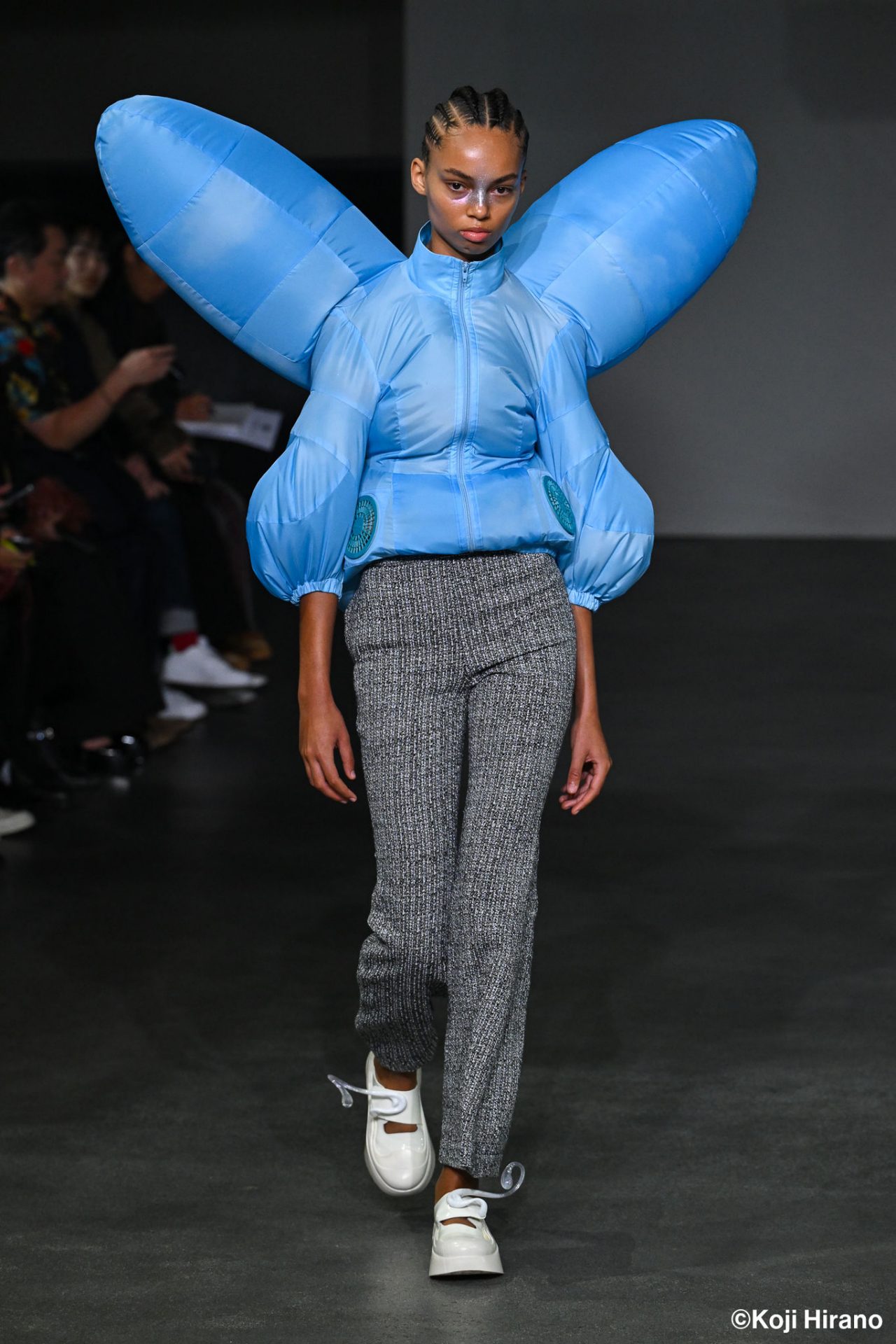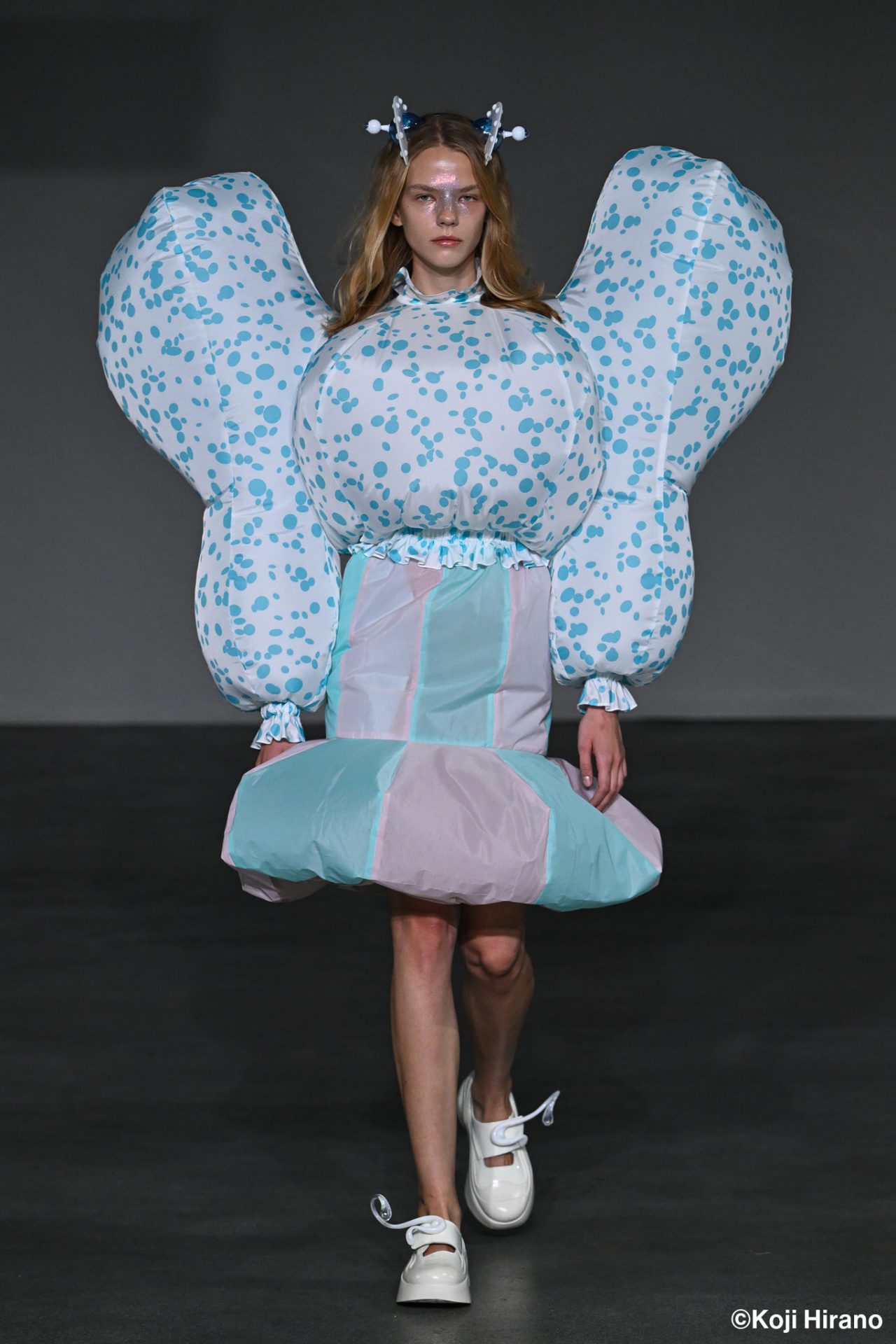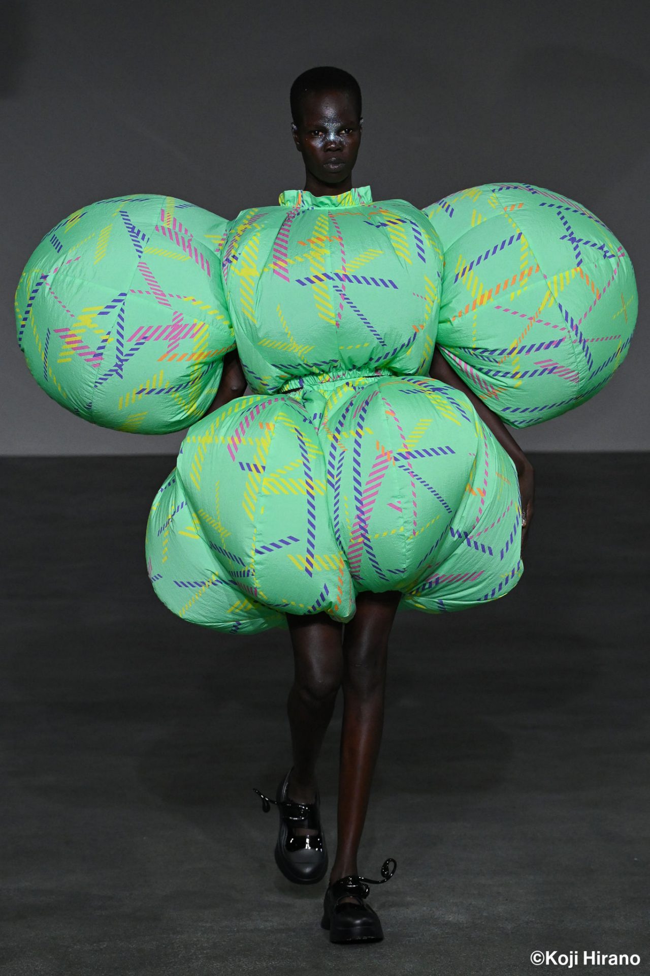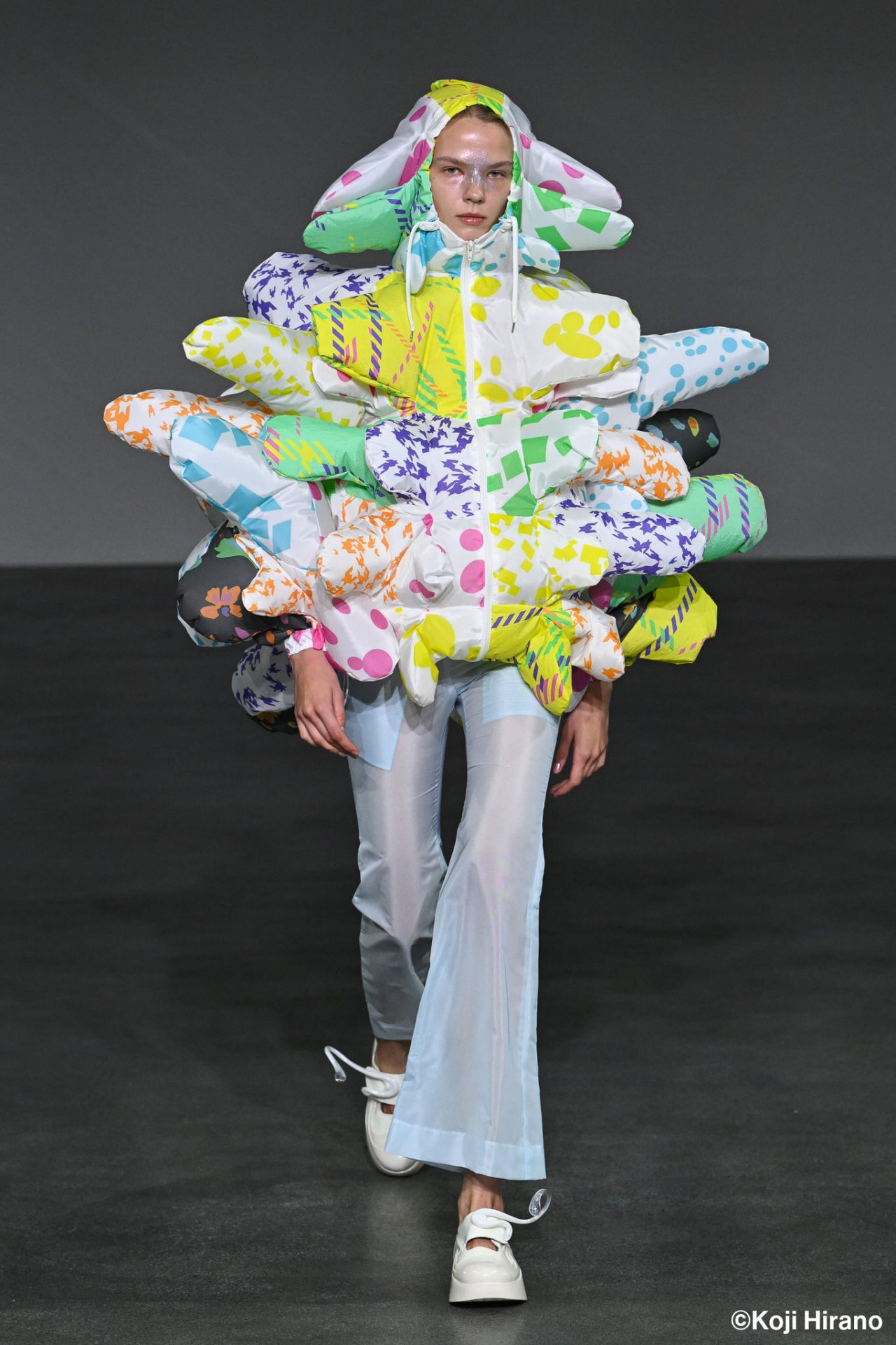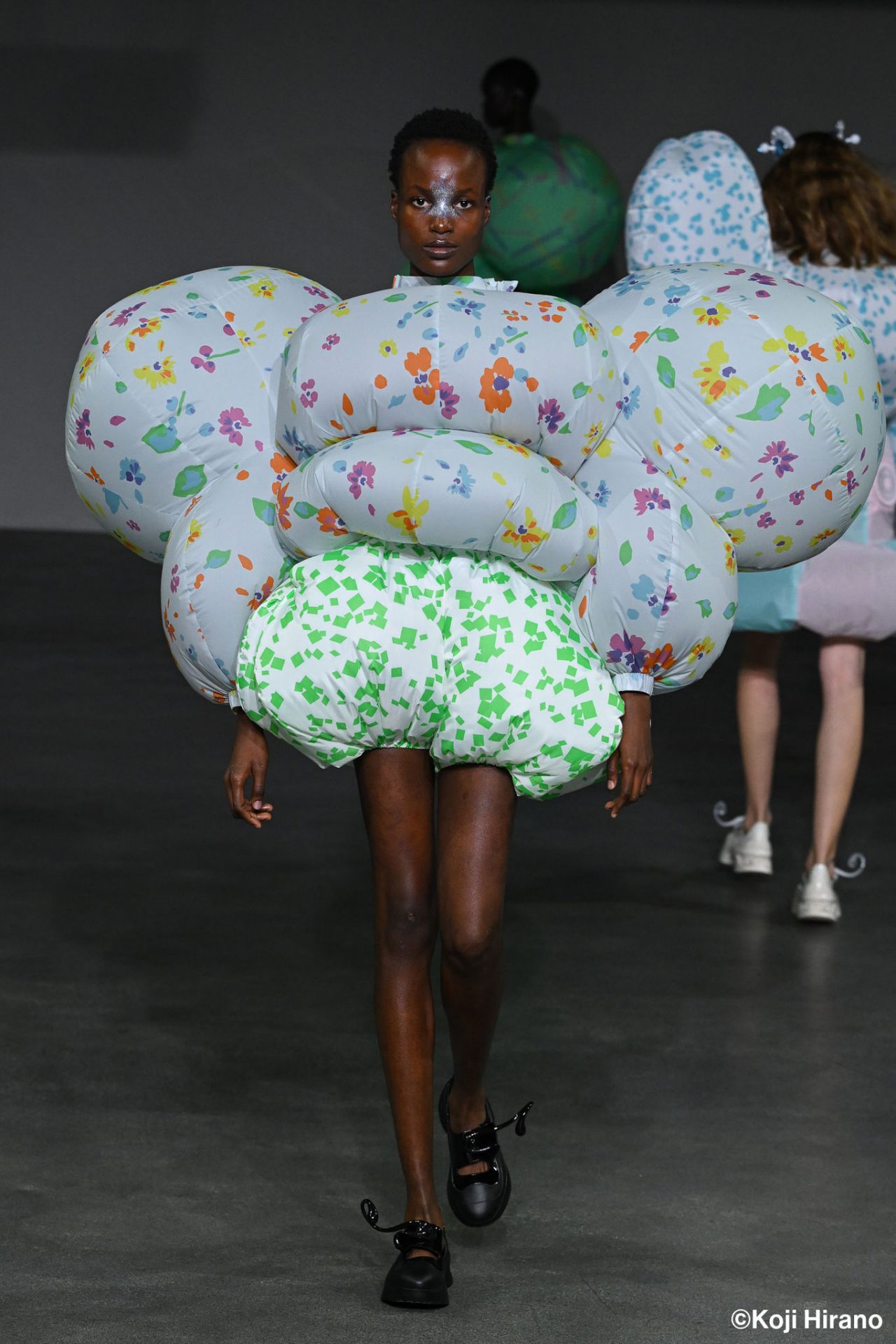 今回のコレクションのコンセプトは「WIND(風)」です。目に見えない風の力を可視化しました。洋服にはファンが付いており、ファンから風を洋服の中に送り込むことができます。ファンがONになると、送り込まれた風によって、日常的なフォルムだった洋服は、非日常のフォルムに変形していきます。風が止むと、洋服のフォルムは再び重力によってドレープの出るデイリーウェアに変わります。またファッションにはなくてはならないグラフィックデザインを通じて、風を可視化できるのではないかと思いました。通常のグラフィックプリントは、重力の概念がなく、規則正しく整列されていますが、もしもそこに風が吹いたとしたらグラフィックのパターンそのものが地球上の重力から解放され、自由に空に舞うのではないかと考えました。花柄は花びらが舞い、水玉や市松柄や千鳥柄やタータンチェックでさえも、自由に空間を舞うようなグラフィックデザインをつくりました。グラフィックで包まれたテキスタイルの空間の中に風が送り込まれることで、コレクションテーマである風を服のフォルムと視覚的なビジュアルで表現しました。