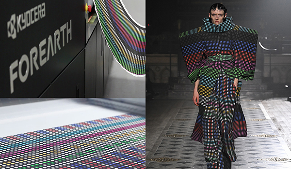 ANREALAGEと京セラのコラボレーションも3回目を迎え、今回のコレクションでは “SCREEN” をテーマに、洋服そのものが光を映し出す媒体となる新たな表現に挑戦しました。FOREARTHの8色インクのプリント技術を活かし、従来のCMYK4色では難しかった光の三原色RGB(Red/Green/Blue)の鮮やかな発色を実現。光の印象を損なうことなく、まるで発光しているかのような視覚効果を生み出しました。また、ジャガードやベルベットなどのテクスチャーのある生地にも、顔料インクがその風合いを損なうことなくしなやかに馴染み、新たな質感表現を可能にしました。