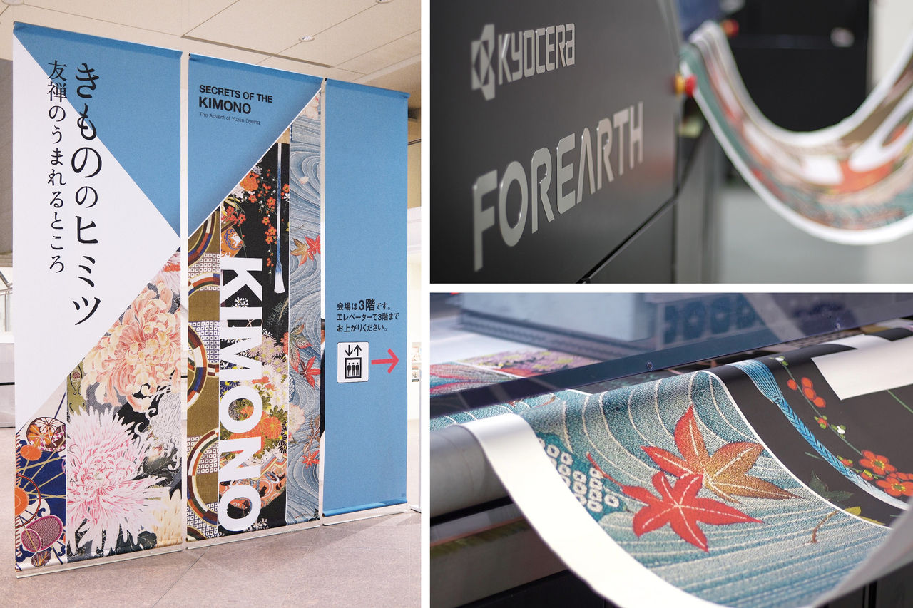 京セラドキュメントソリューションズ株式会社は、現在京都国立近代美術館で開催中の展覧会「きもののヒミツ 友禅のうまれるところ」に協賛し、当社の捺染インクジェットプリンター「FOREARTH(フォレアス)」 でプリントした生地を使用した装飾が、公開されております。