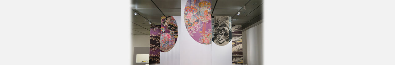 本展では約100点にも及ぶ友禅染裂※や、重要無形文化財保持者(人間国宝)の作品が展示されており、1階のエントランスホール、3階企画展示室内にて、当社の環境にやさしい捺染インクジェットプリンター「FOREARTH」でプリントされた生地が装飾として会場を彩っています。