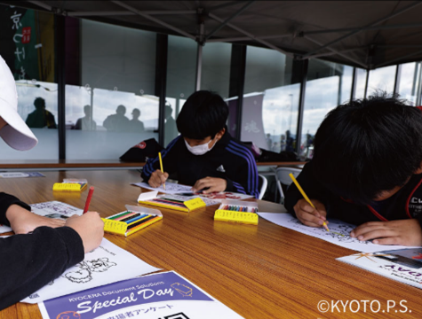 毎年開催している「京セラドキュメントソリューションズ スペシャルデー」では、サンガとコラボレーションしたデザインのスマートフォン用クリーナーの来場者への配布や、特設ブースでの塗り絵の体験会などを実施しており、これらの印刷物は当社の捺染インクジェットプリンターや複合機で制作しています。こうした取り組みを通じて、試合の盛り上げに寄与するとともに、クラブやサポーターとのつながりを深め、地域との協働による社会的価値の創出に努めています。