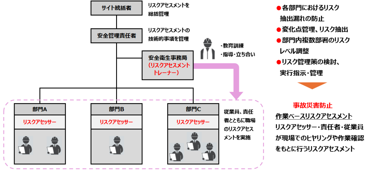日本国内では、事故災害を防止するため、各拠点でリスクアセスメントトレーナーおよびリスクアセッサーを選任し、リスクアセスメントを展開しています。トレーナーやアセッサーは、実習や研修でアセスメントに必要な基礎知識やスキルを習得した上で、アセスメントを実施し、適切なリスク抽出・評価により危険性を把握した上で対策を実施し、災害の未然防止に繋がるアセスメントを実施しています。