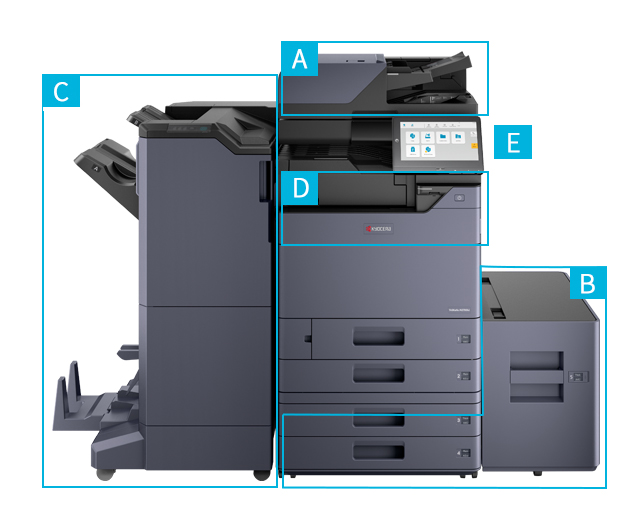 Stacking up to 4,000 sheets. Supports 2-tray sorting, shift-sorting and stapling, with optional punch unit, booklet folder, and Z-fold unit.